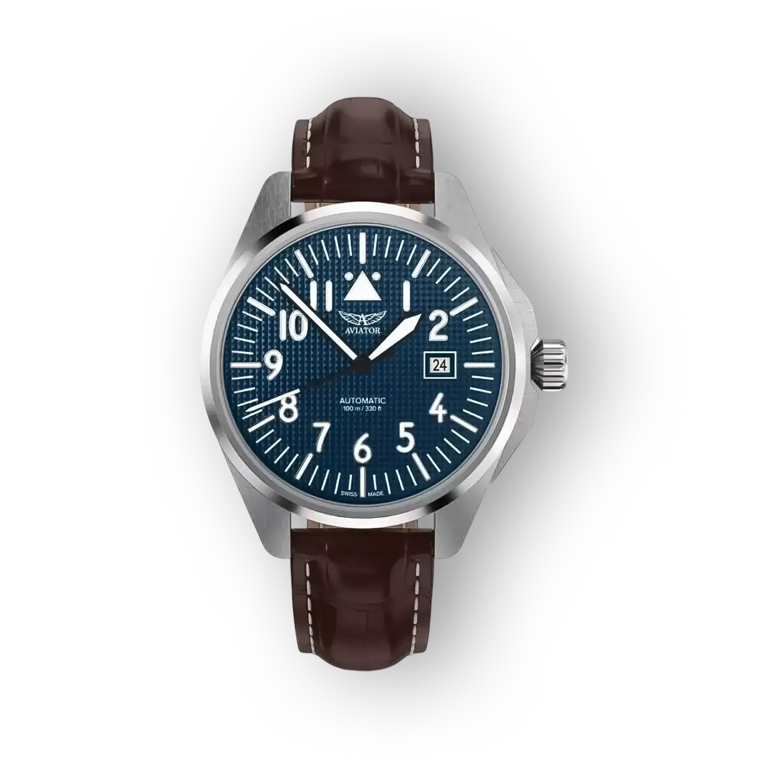 Aviator V.3.39.0.334.4 egy automata, analóg karóra, amely 100 m vízállósággal és rozsdamentes acél tokkal rendelkezik, így alkalmas mindennapi viseletre és aktív használatra. A 42.8 mm-es tokátmérő és a kék számlap jó olvashatóságot biztosít.
