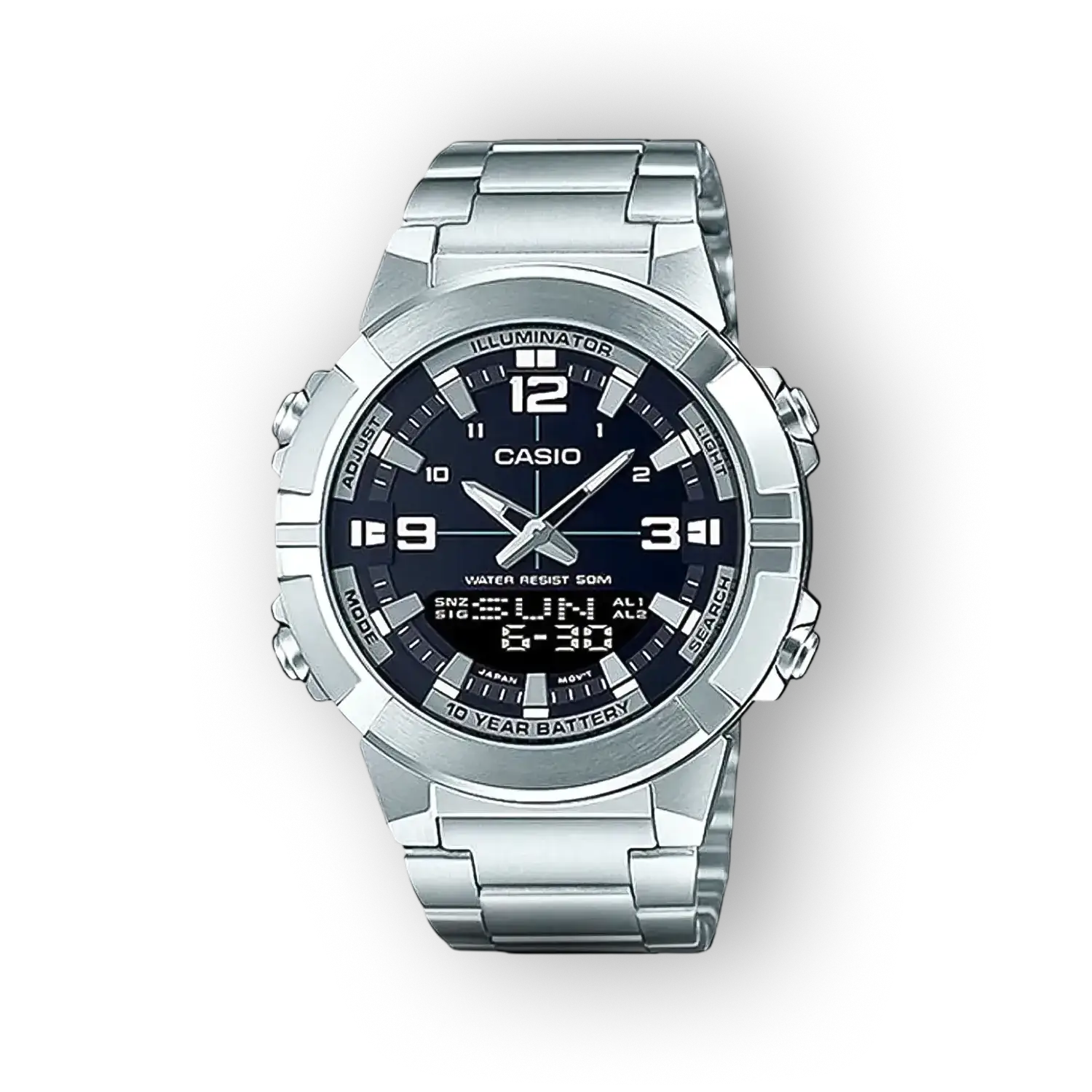 A Casio AMW-870D-1AVDF konzervatív, funkcionalitásra rendezett kialakításával olyan választás, amely hosszú távon szolgálja a mindennapi időmérést. A 44 mm-es tokát