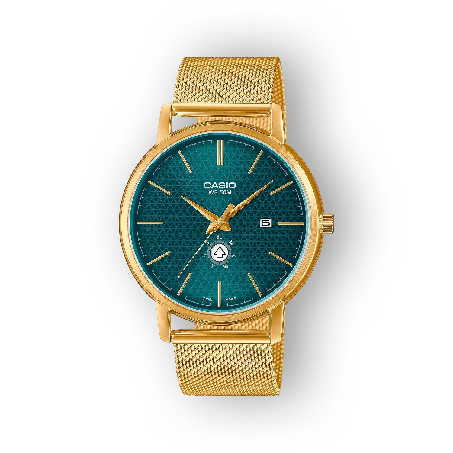 A Casio MTP-B125MG-3AVDF egy praktikus, jól megtervezett analóg karóra, amely a mindennapi használat igényeit szolgálja anélkül, hogy felesleges komplikációkat vinne a funkcionalitásba. A zöld számlap és arany szíj kombinációja eleg