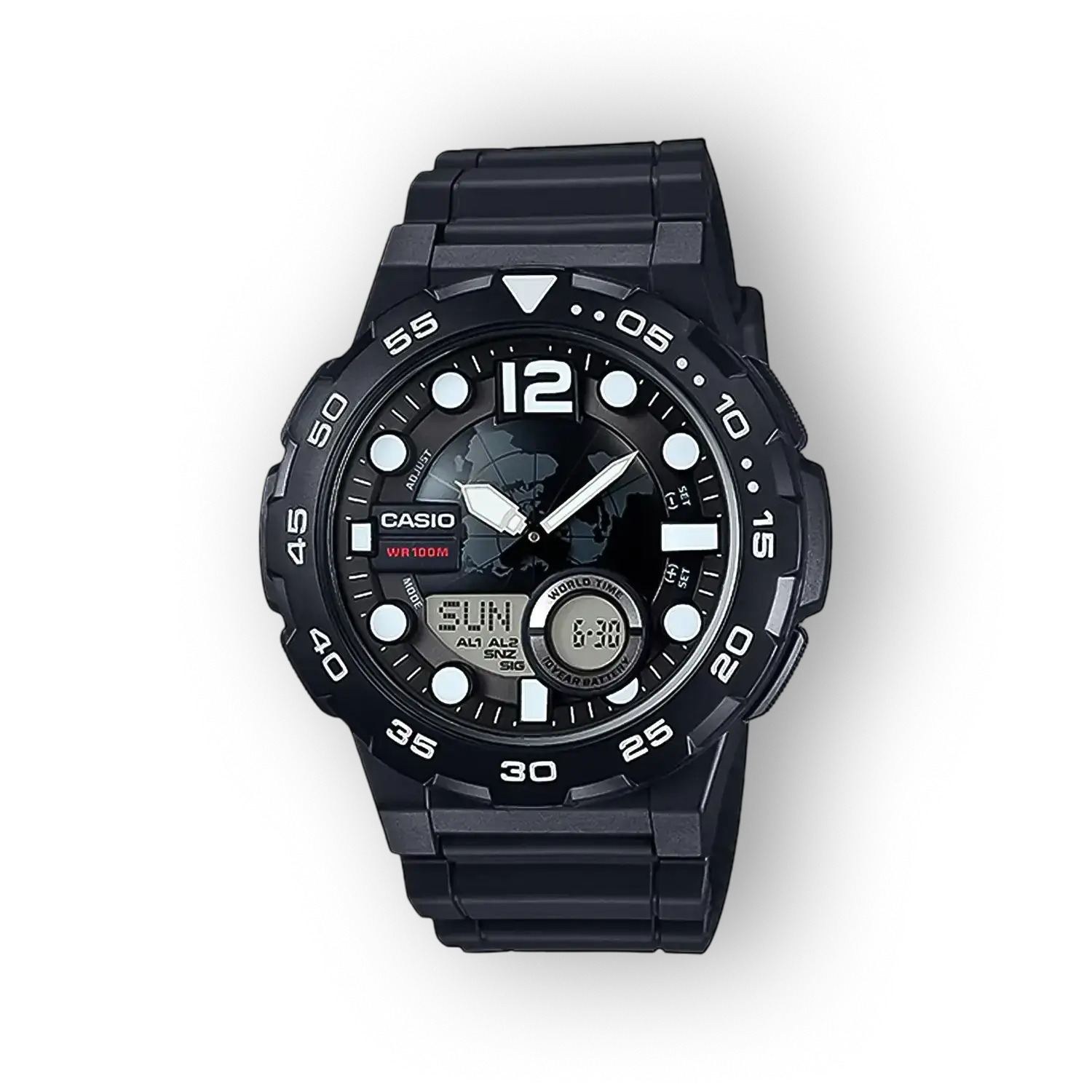 A Casio AEQ-100W-1AVEF tartósságát a műanyag tok, a strapabíró szíj és a 100 m vízállóság kombinációja adja; ez egy praktikus, hosszú távon használható darab, amely megfelel az általános karc- és ütésigényeknek.