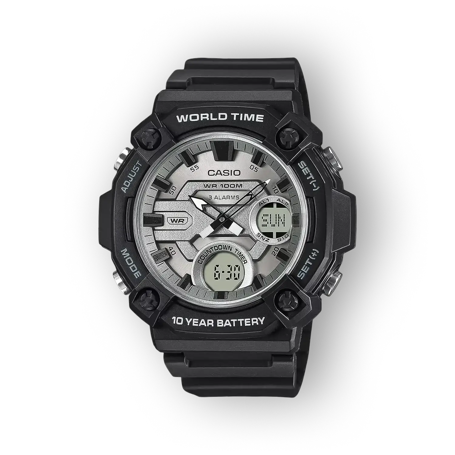 A Casio AEQ-120W-2AVDF praktikus, mindennapi viseletre tervezett férfi karóra, amely ötvözi a megbízható kvarc szerkezet stabilitását és a sportos, mégis letisztult megjelenést. Ez a modell kék számlapjával és kék szíjával diszkrét, de határozott stílust kínál, miközben a 100 m-es vízállóság miatt kültéri használatra és vízhez közeli tevékenységekhez is alkalmas. A Casio AEQ-120W-2AVDF jól illeszkedik azokhoz, akik egy tartós, egyszerű kezelhetőségű időmérőt keresnek.