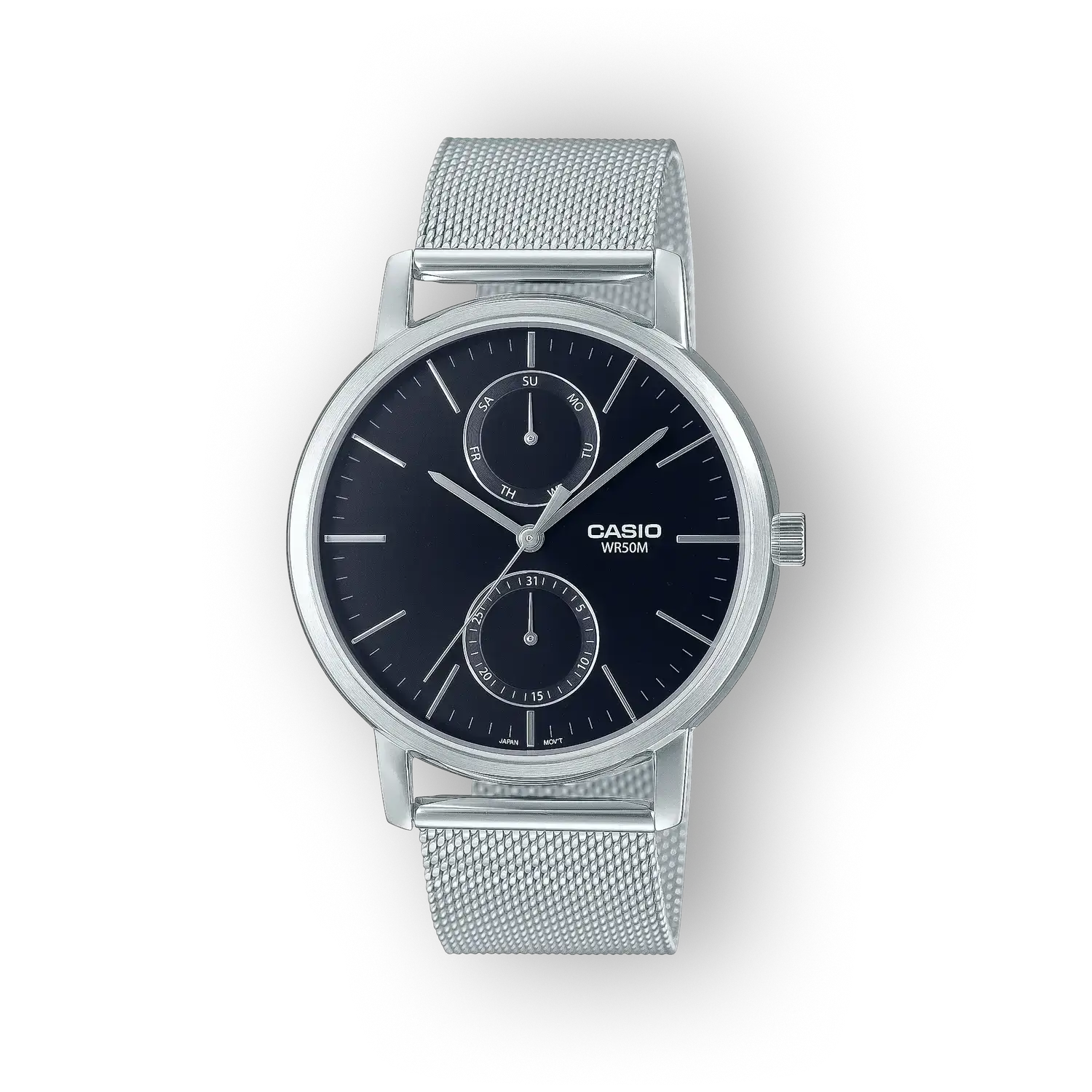 A Casio Collection MTP-B310M-1AVEF a márka ismert hozzáállásának tárgya: egyszerre funkcionális és visszafogottan elegáns. Ez a modell analóg kijelzős, mindennapi viseletre szánt karóra, amely a rozsdamentes acél külső megjelenésével és 50 méteres vízállóságával hosszú távon megbízható társ lehet. A Casio MTP-B310M-1AVEF precíz quartz szerkezete és egyszerű, fekete számlapja könnyen illeszkedik különböző öltözékekhez.