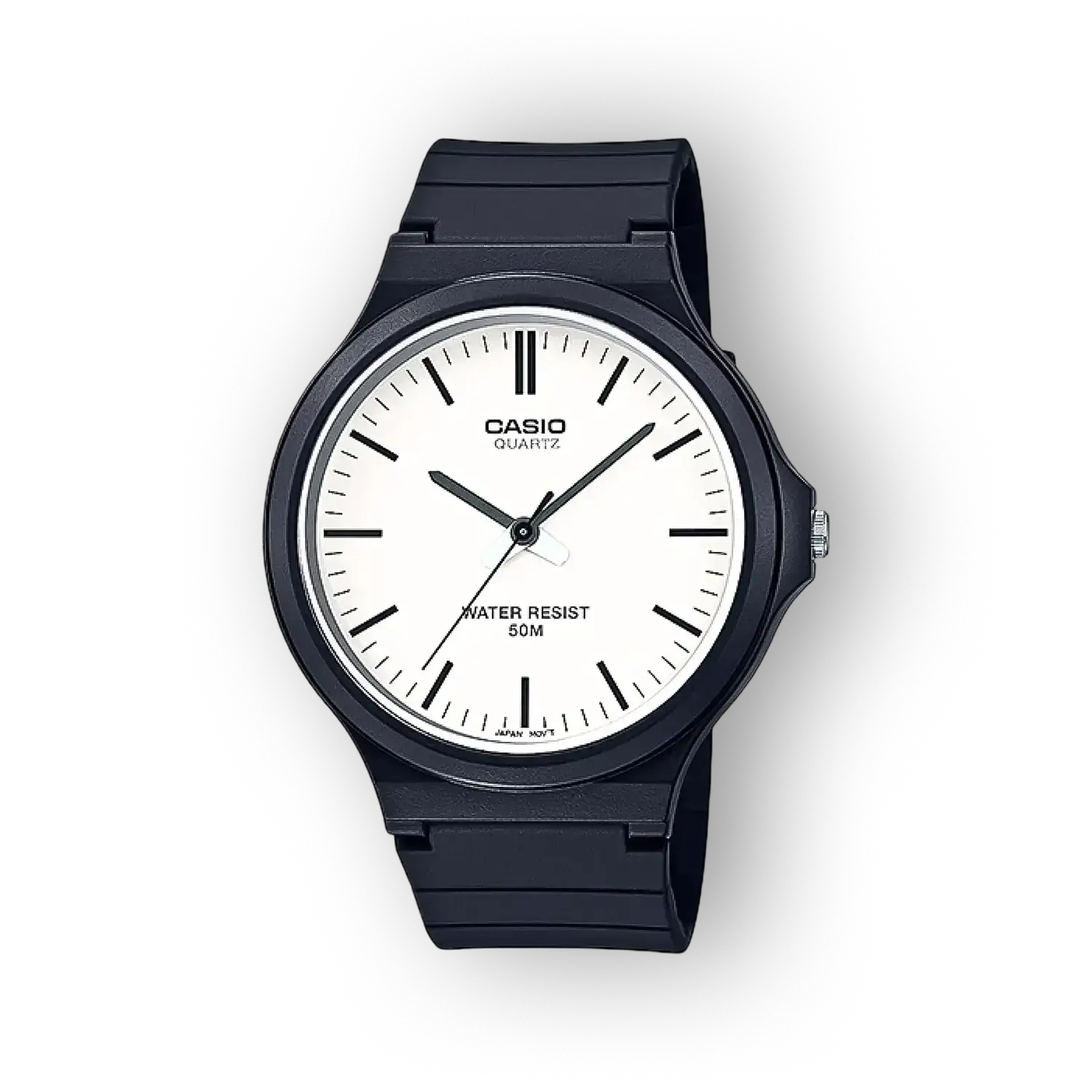 A Casio MW-240-7EVEF áttekinthető, egyszerű dizájnnal megalkotott analóg karóra, amely a mindennapi viselethez tervezett funkcionalitást és tartósságot ötvözi. A visszafogott fehér számlap és fekete szíj kombinációja klasszikus megjelenést ad, miközben a szerkezet és a vízállóság használhatóságot biztosít. Ez az óra azoknak készült, akik megbízható, nem túlzó megoldást keresnek.