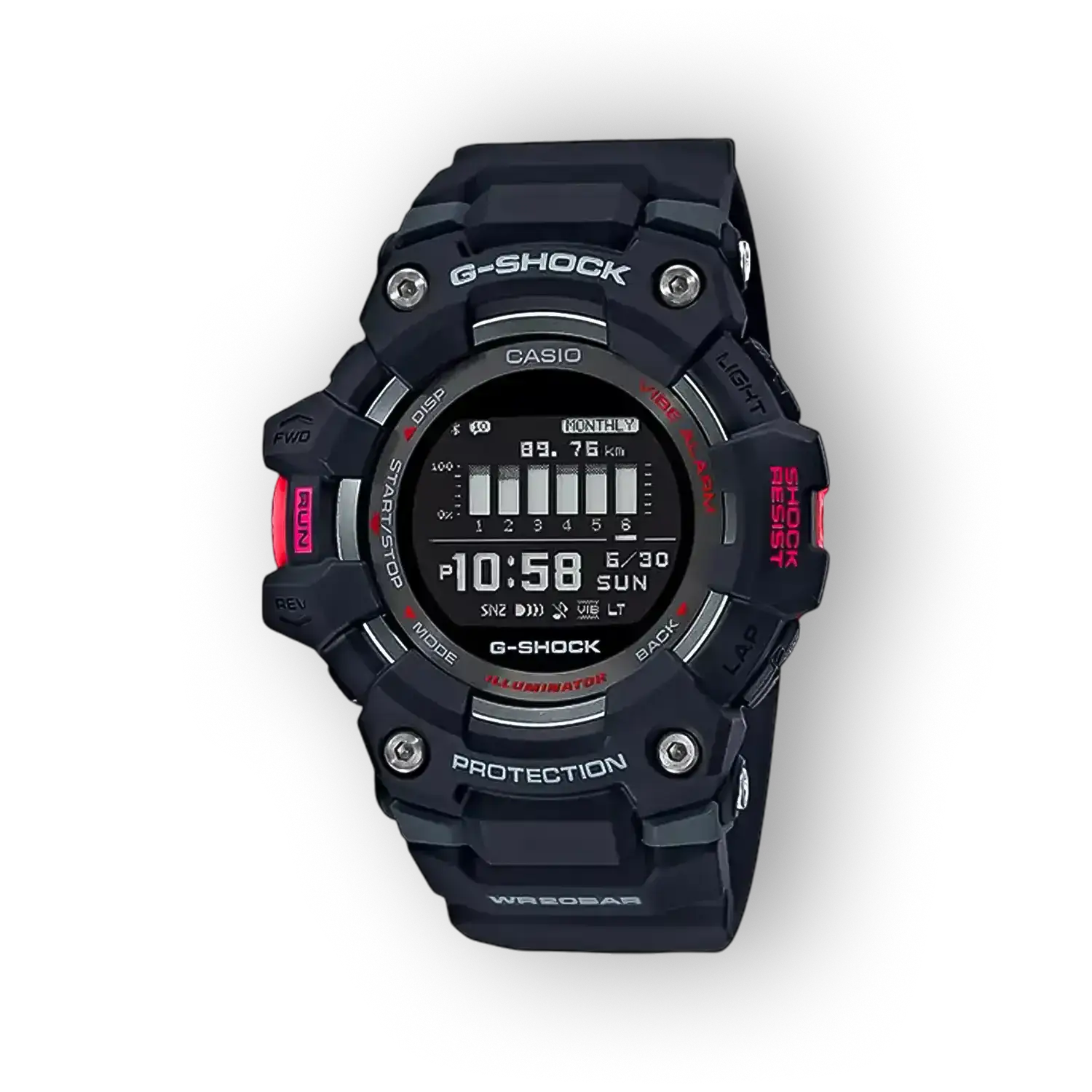 A Casio GBD-100-1ER a sportos funkcionalitásra és könnyű leolvashatóságra helyezi a hangsúlyt, LCD számlapjával és nagy tokátmérőjével. Emellett a 200 m-es vízállóság és a quartz pontosság egyben ad megbízhatóságot és tartósságot.