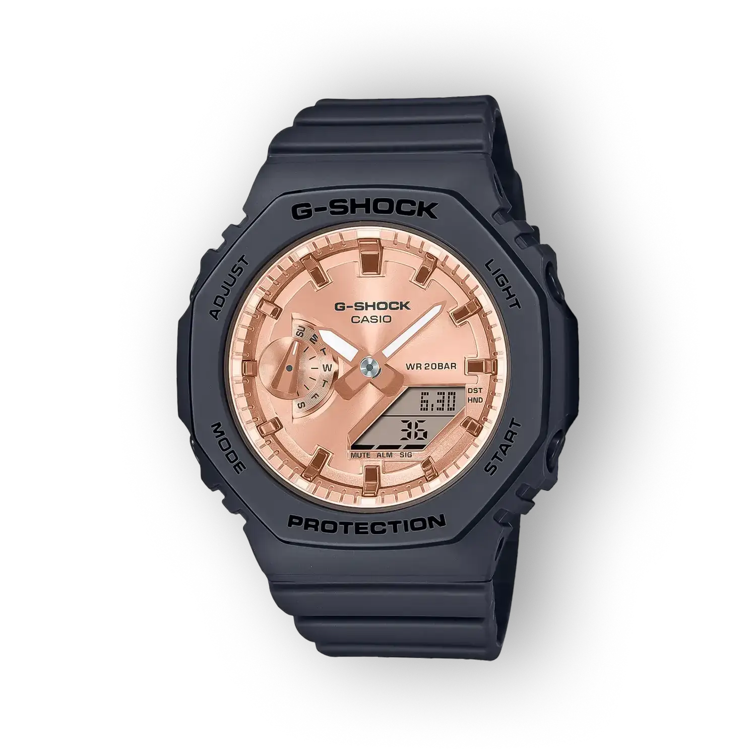 - Tok anyaga: Műanyag A műanyag tok könnyű, ütésálló kialakítást tesz lehetővé, ami csökkenti a csuklón érzett terhelést. A nyersanyag kiválasztása hozzájárul a G-Shock jellegű ütésállósághoz és a karóra tartósságához.