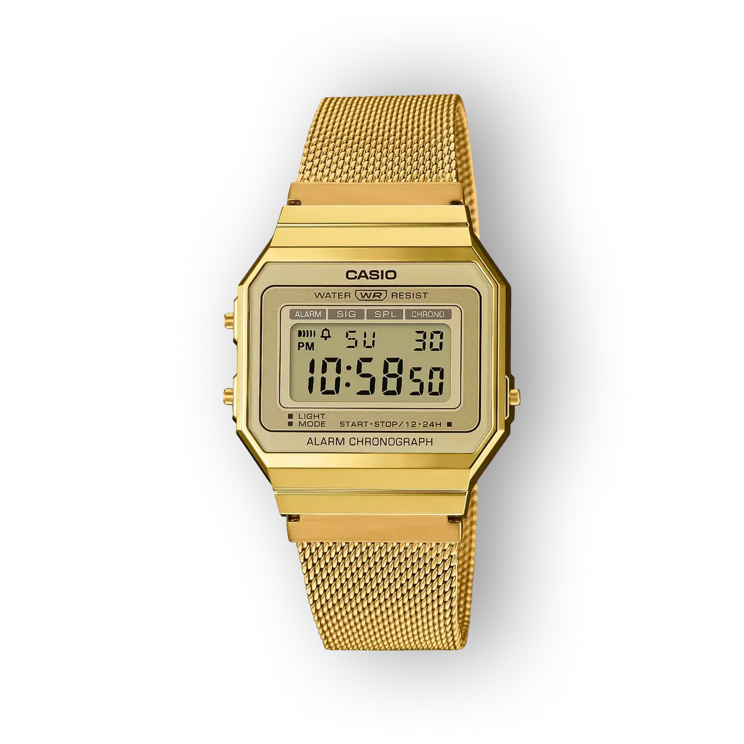 A Casio A700WEMG-9AEF karóra a klasszikus retro dizánt és a napi használatra tervezett funkcionalitást ötvözi. Ez a modell kis méretű, mégis áttekinthető kialakítással rendelkezik, amely alkalmas mindennapi viseletre és visszafogott, prémium hatású megjelenést ad viselőjének. A Casio A700WEMG-9AEF egyszerre utal a márka presztízsére és a megbízhatóságra a quartz szerkezet révén.