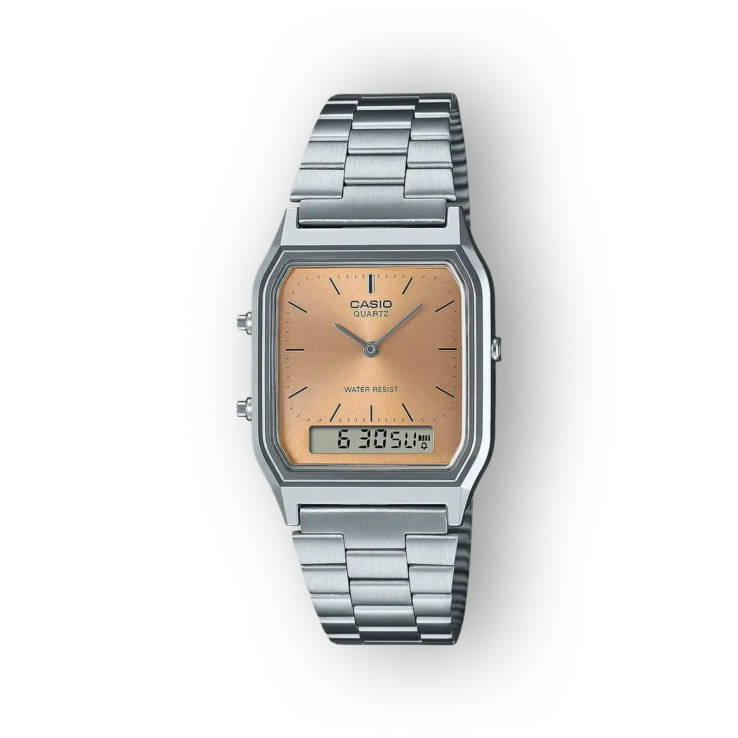 A Casio AQ-230A-4AMQYES egy visszafogott, mégis kifinomult megjelenésű karóra, amely a klasszikus analóg-stílus és a megbízható kvarc szerkezet előnyeit egyesíti. A modell eleganciáját a vörös arany számlap és az ezüst szíj kombinációja adja, ami hétköznapi és alkalmi viseletben egyaránt harmonikus. A Casio AQ-230A-4AMQYES kialakítása olyan felhasználóknak szól, akik értékelik a letisztult formanyelvet és a tartós, könnyű anyaghasználatot.