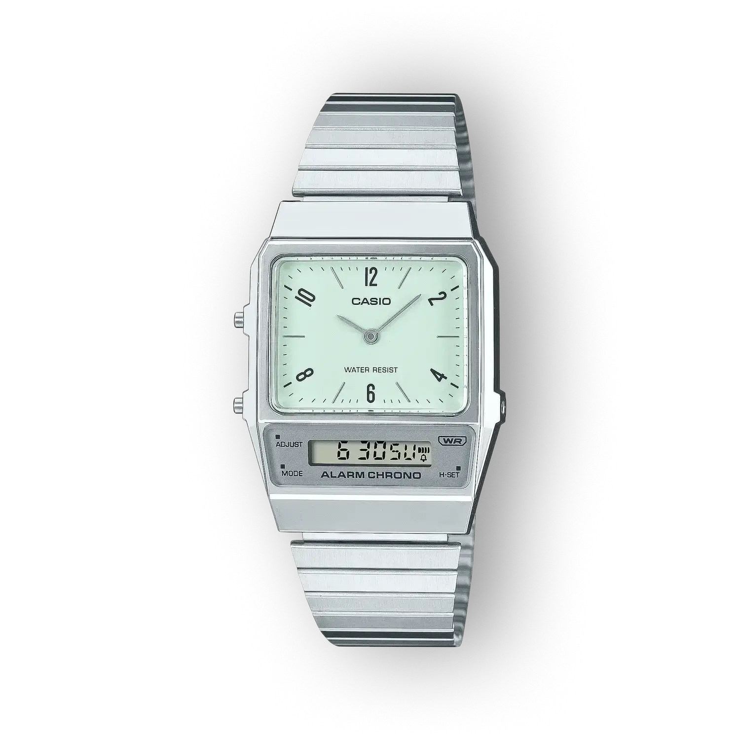 A Casio AQ-800E-3AEF egy funkcionálisan kiegyensúlyozott, napi használatra tervezett karóra, amely letisztult megjelenéssel és megbízható szerkezettel szolgál. Azokra a felhasználókra fókuszál, akik egyszerre keresnek praktikumot és visszafogott esztétikát; a zöld számlap és ezüst szíj kombinációja elegáns, mégis hétköznapi viseletre alkalmas. A modell a klasszikus quartz megbízhatóságát kínálja, miközben könnyű, műanyag tokkal és 30 méteres vízállósággal rendelkezik.