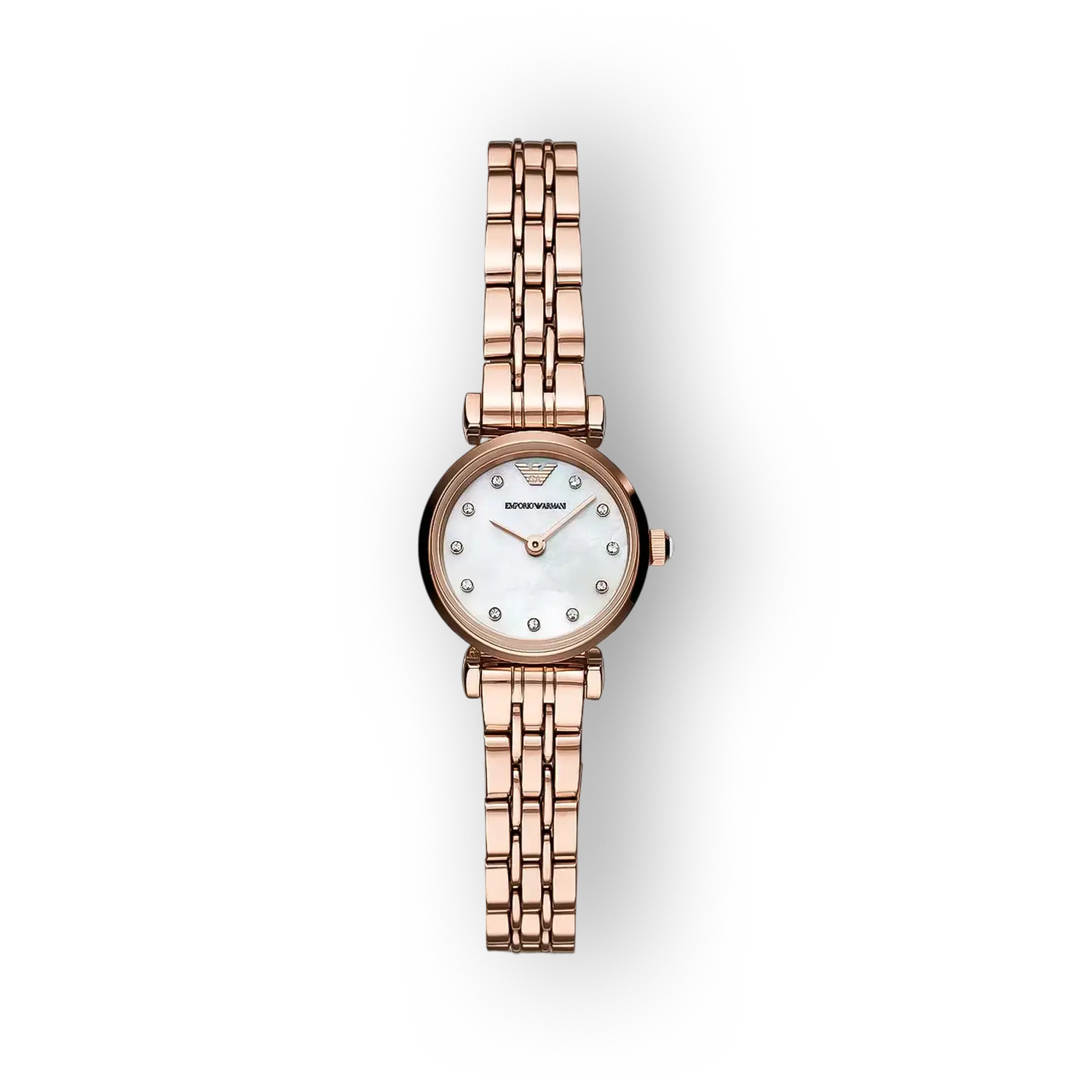 Az Emporio Armani Gianni T-Bar AR11203 egy letisztult, női irányultságú karóra, amely ötvözi a kifinomult formatervezést és a megbízható működést. Az Emporio Armani AR11203 megjelenése alkalmas mindennapi viseletre és elegánsabb megjelenésekhez is; a gyöngyház számlap és a vörös arany tónusok finom, de határozott karaktert adnak az órának.
