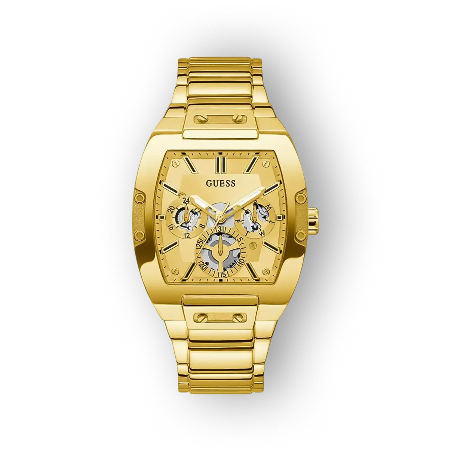 A Guess Phoenix GW0456G2 kifinomult, arany tónusú megjelenéssel rendelkező karóra, mely elegáns, mégis hétköznapi viseletre tervezett konstrukciót kínál. Az analóg kijelzős, quartz szerkezet precíz időmérést biztosít, miközben a 43 mm-es tokátmérő kompromisszummentes jelenlétet ad a csuklón. Ez a modell a márka stílusjegyeit kombinálja a praktikus funkciókkal, így alkalmas üzleti és szabadidős környezetben egyaránt.