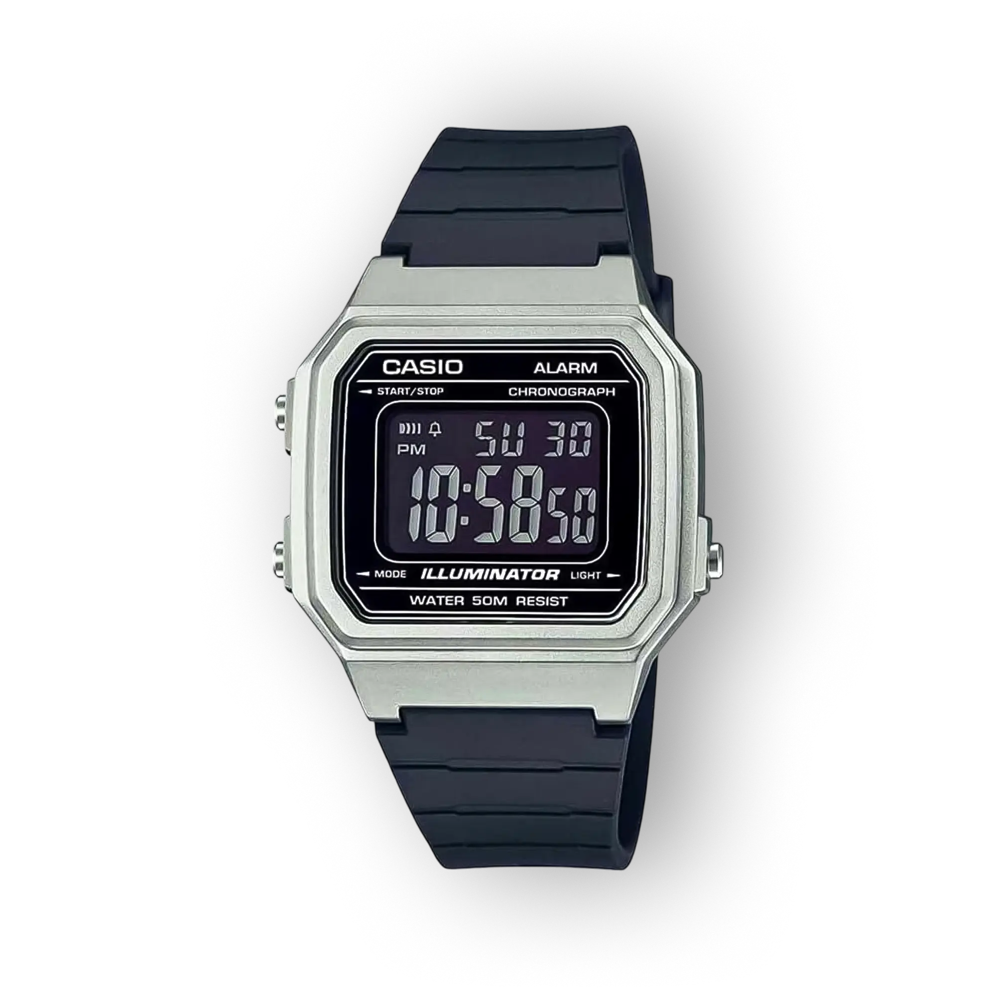 Fekete háttéren látható a Casio digitális karóra, ezüst színű tokban, fekete szilikon szíjjal, digitális kijelzővel és világítással.