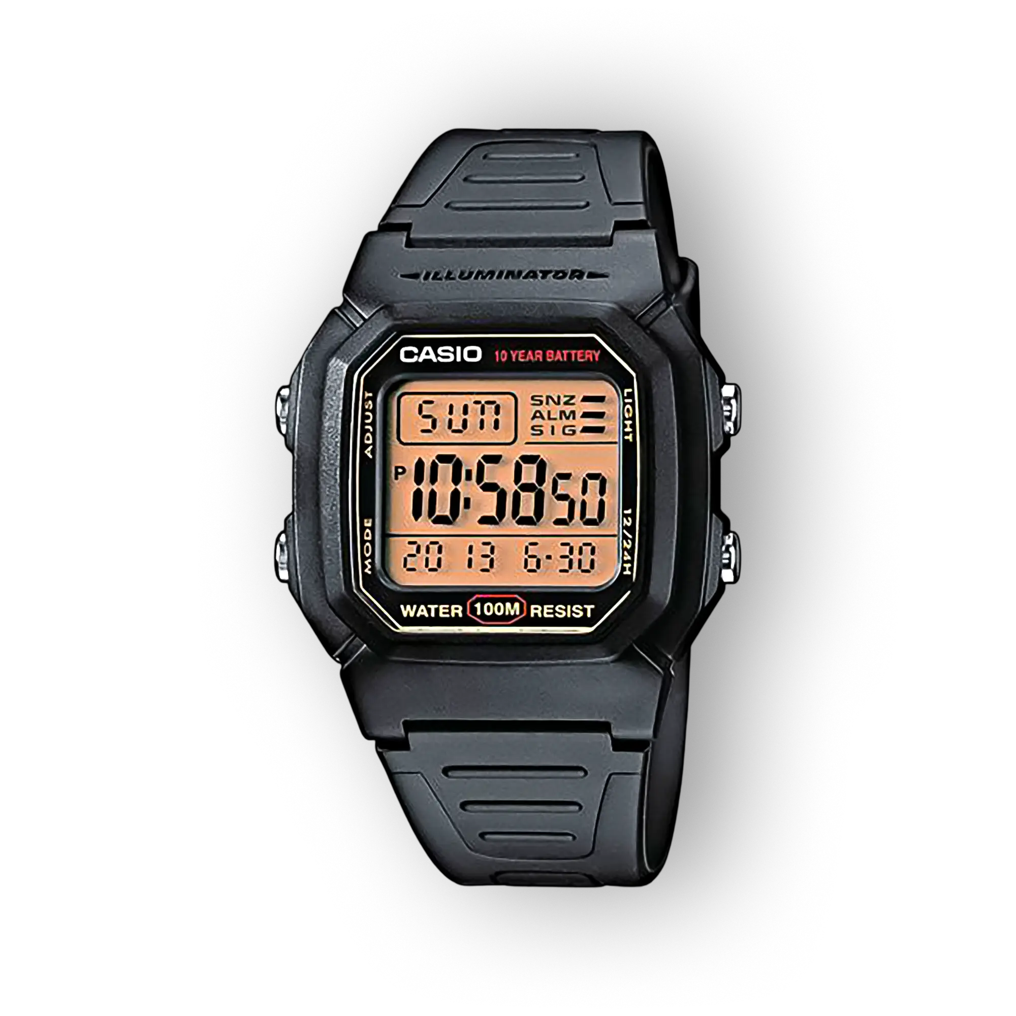 Fekete, digitális Casio óra, aranyszínű számlappal, vízálló 100 m, 10 éves akkumulátor élettartam, hátul világító funkcióval.