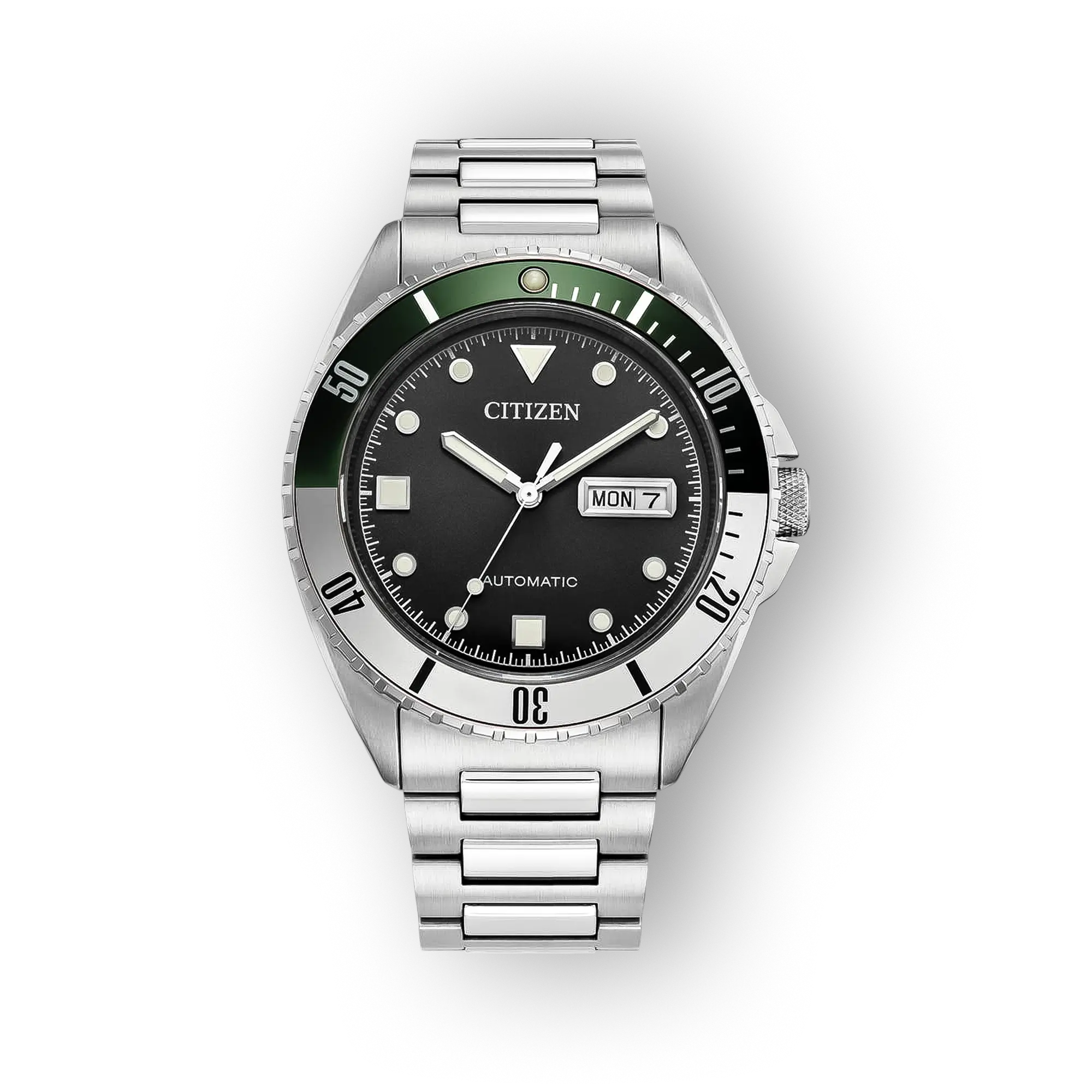 Fekete számlapú, automata Citizen óra ezüst szíjjal, zöld kerettel, nap és dátum kijelzővel, elegáns sportos kialakítással.