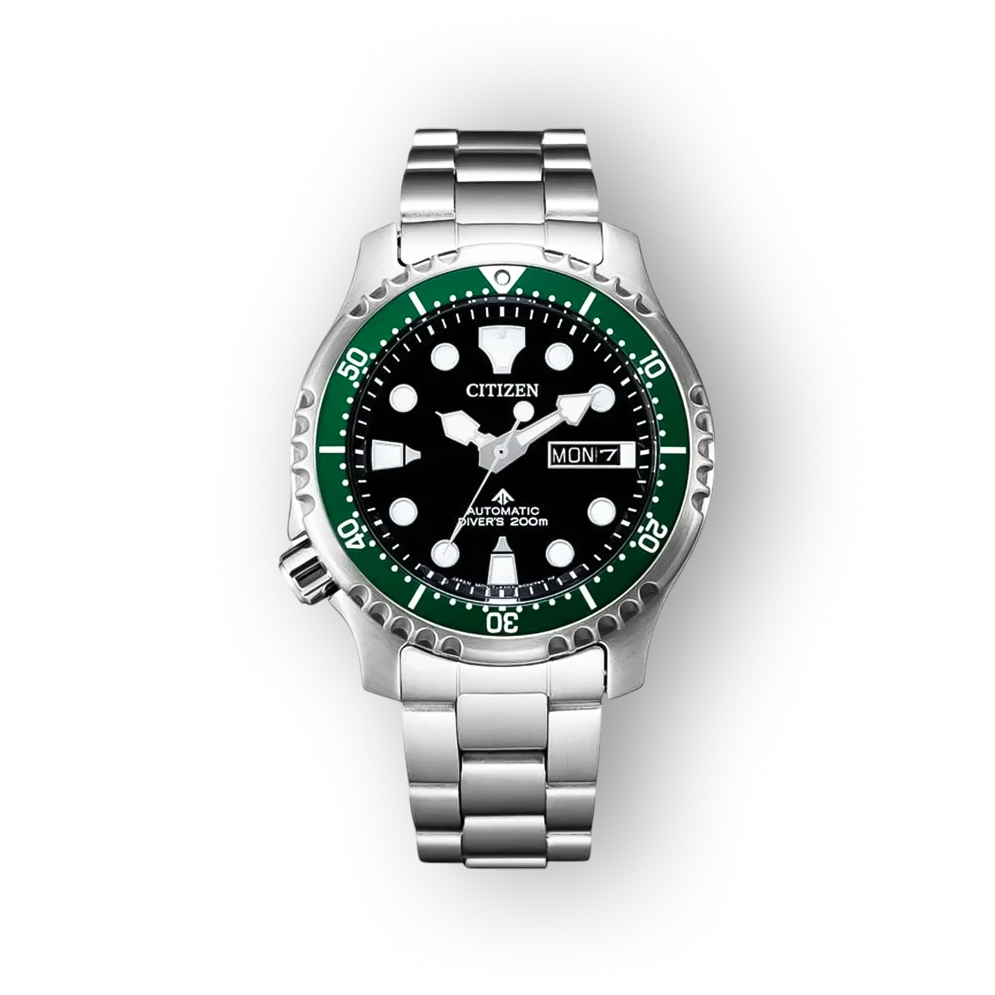 Fekete számlapú, zöld keretes Citizen búváróra ezüst szíjjal, automatikus működéssel és 200 méteres vízállósággal.