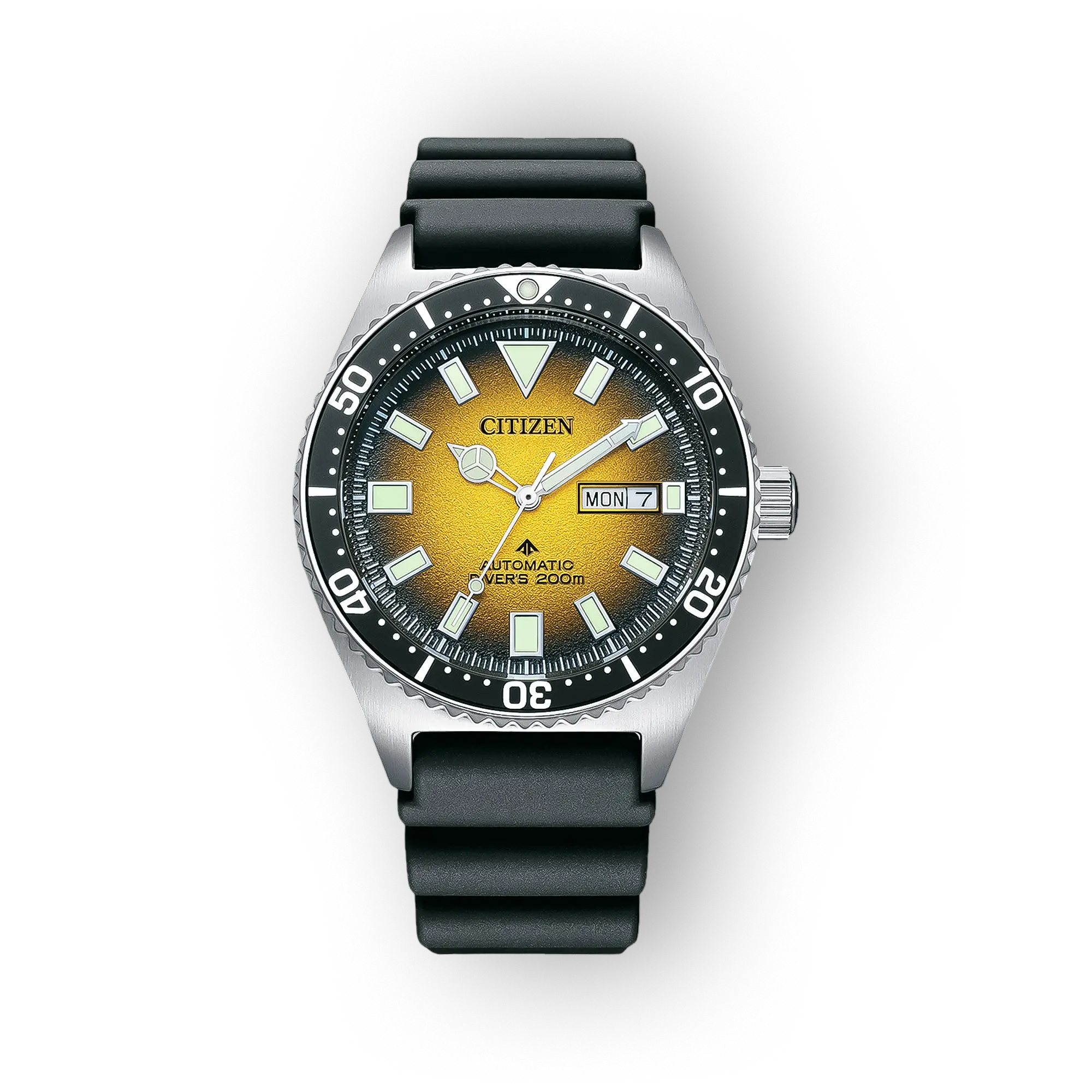 Fekete háttéren álló Citizen Promaster karóra, sárgás arany számlappal, fekete szíjjal, datummal és vízállóság jelzéssel.