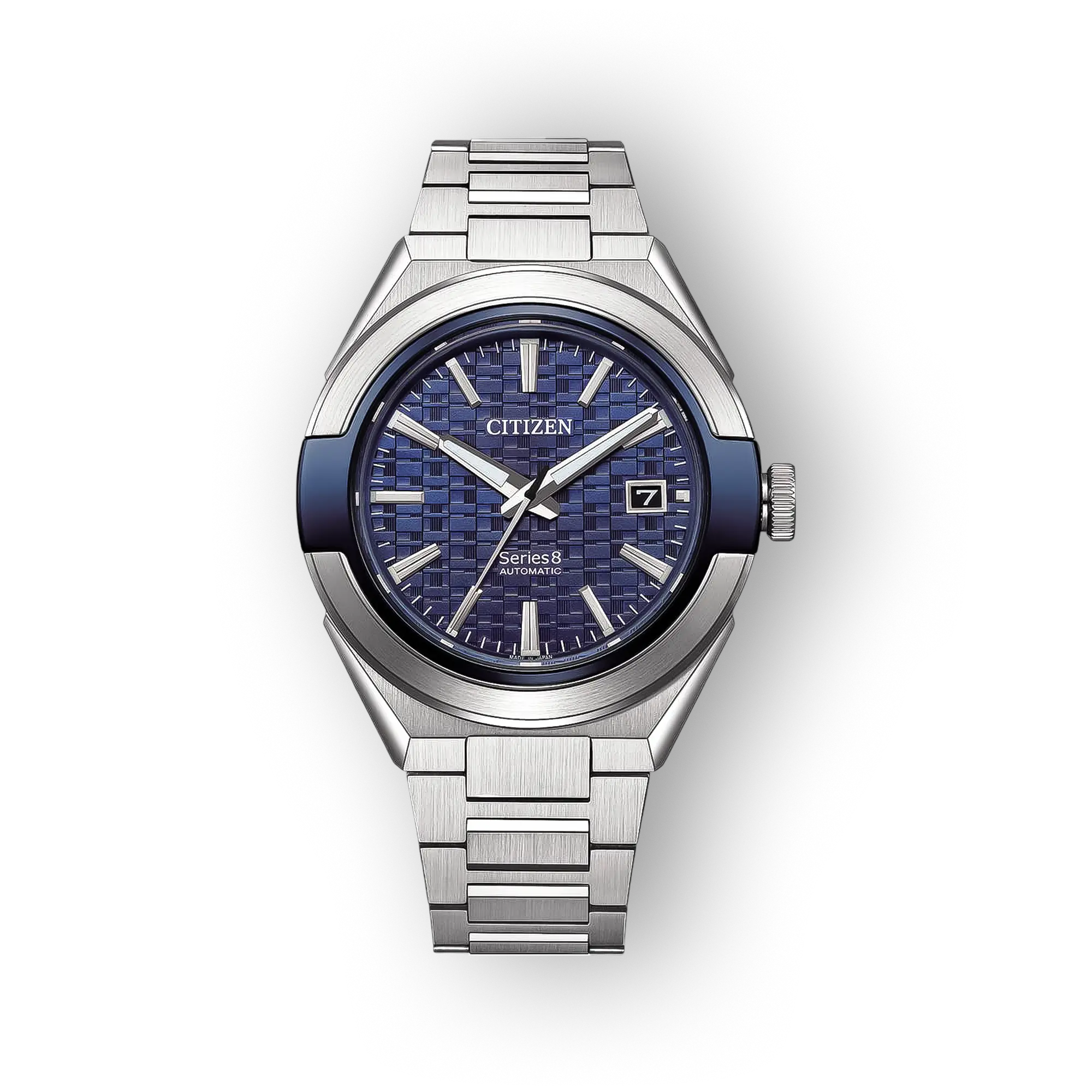 Kék, textúrázott számlapos Citizen karóra, ezüst acél tok és szíj, automatikus működéssel és dátum kijelzővel.