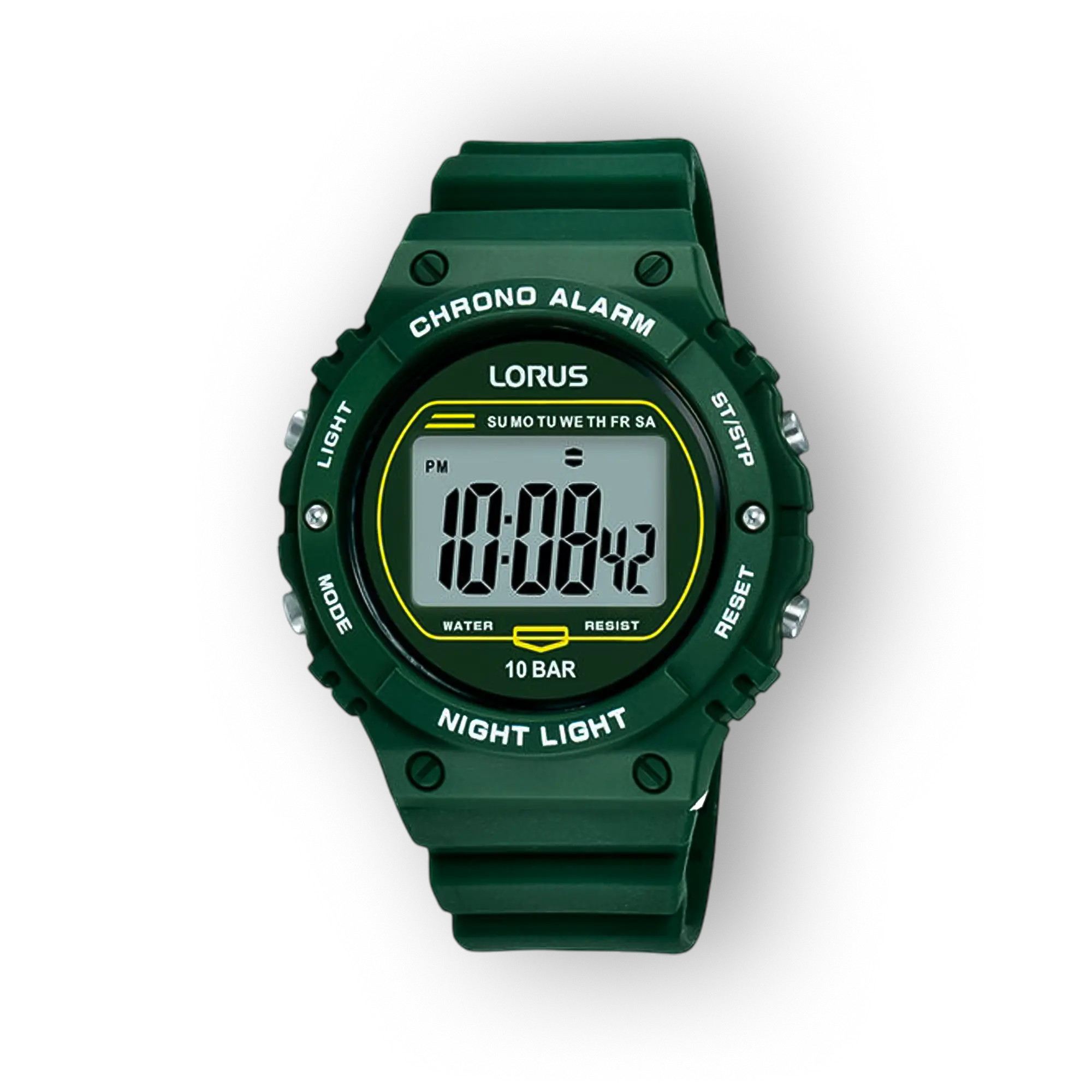 Zöld színű, digitális Lorus karóra, világos kijelzővel, vízállóság 10 bar-ig, éjszakai fény funkcióval, gumírozott szíjjal.