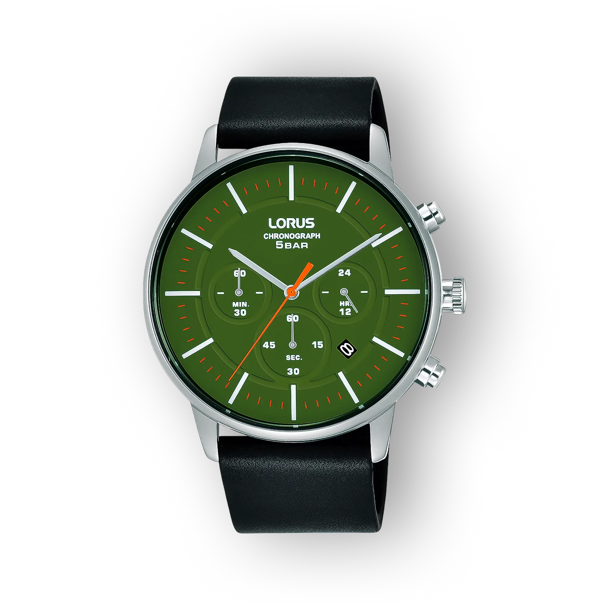Zöld számlapú Lorus karóra, fekete bőrszíjjal, krónográf funkciókkal, ezüst szegéllyel és narancssárga mutatókkal.