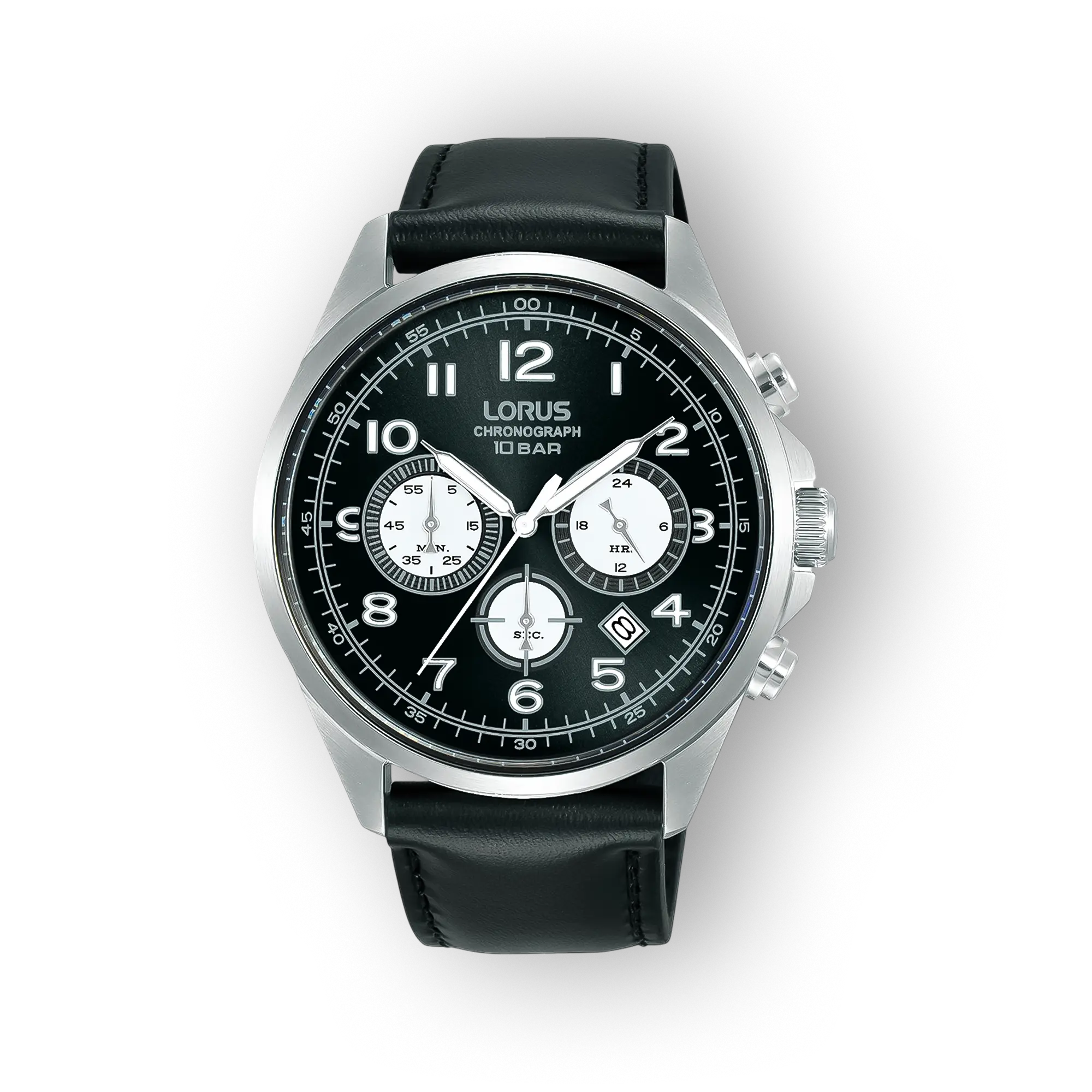 Fekete háttér előtt álló Lorus karóra, ezüst tok és fekete bőrszíj, fehér számlappal és krónográf funkciókkal.