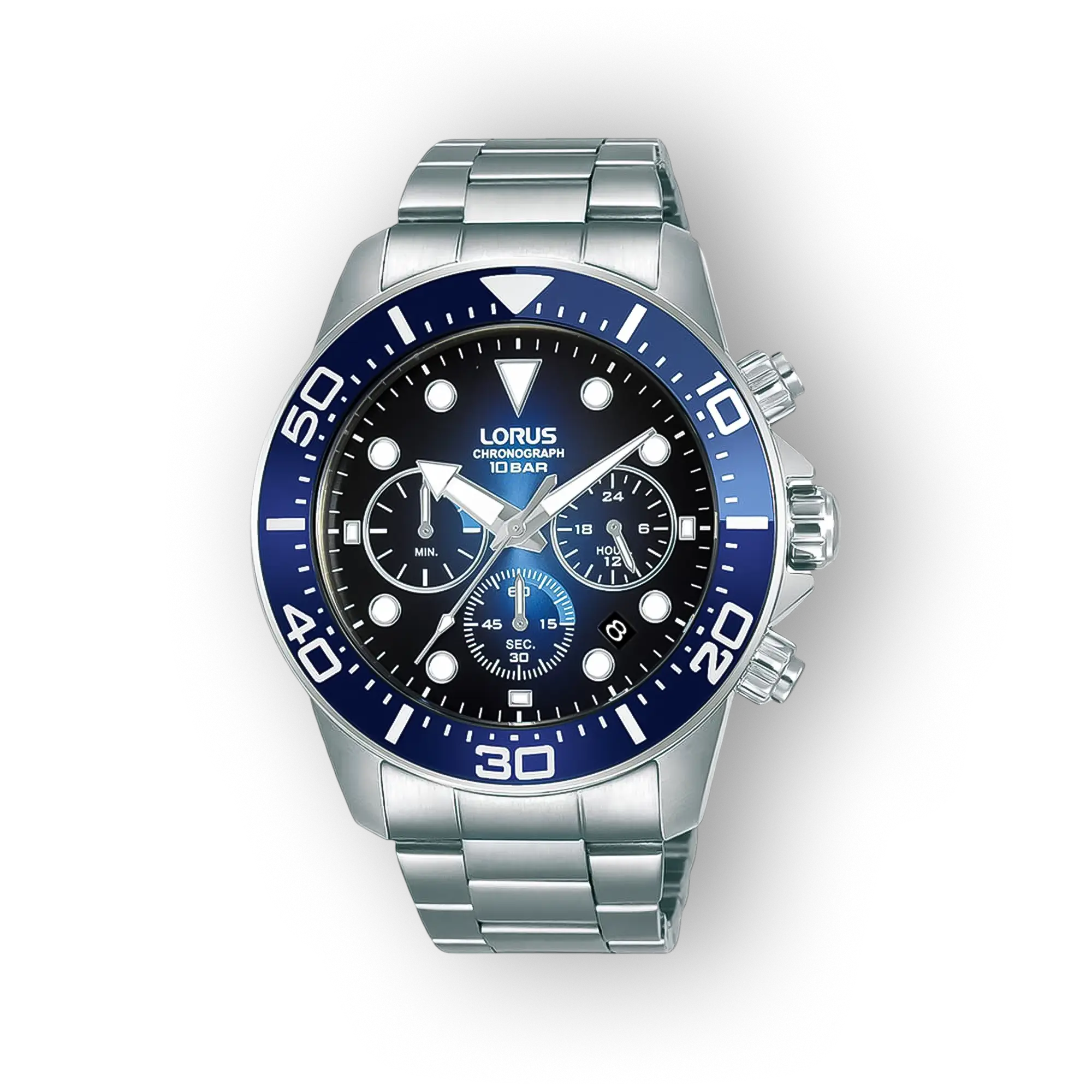 Lorus férfi karóra, ezüst fém szíjjal, kék és fekete számlap, három krónográf számlálóval, fehér világító mutatókkal.