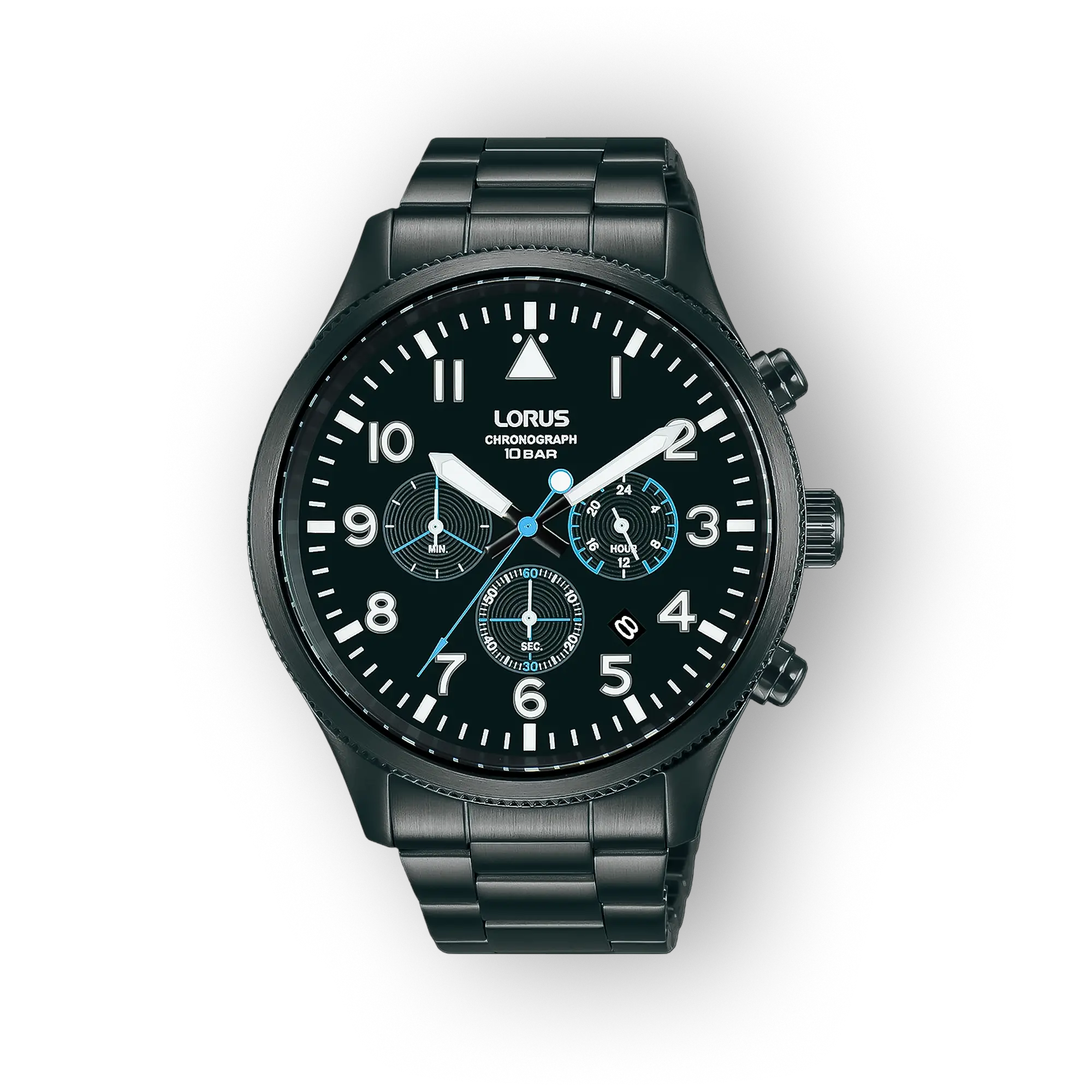 Fekete tárcsájú Lorus karóra, ezüst színű fém szíjjal, kék részletekkel és három különböző számlappal.