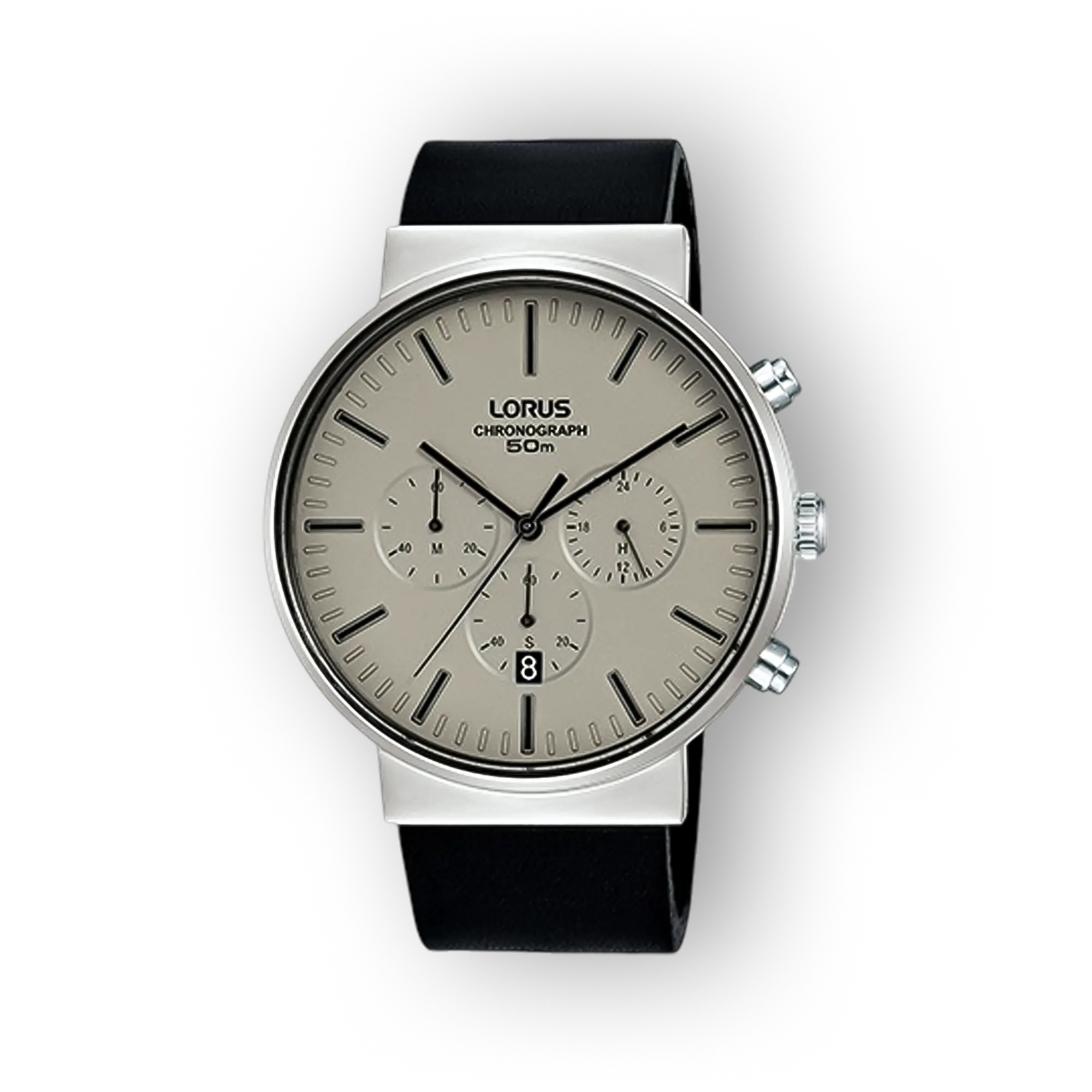 Lorus ezüstszínű kronográf óra fekete szíjjal, világosszürke számlappal, három segédszámlappal és dátum kijelzővel.