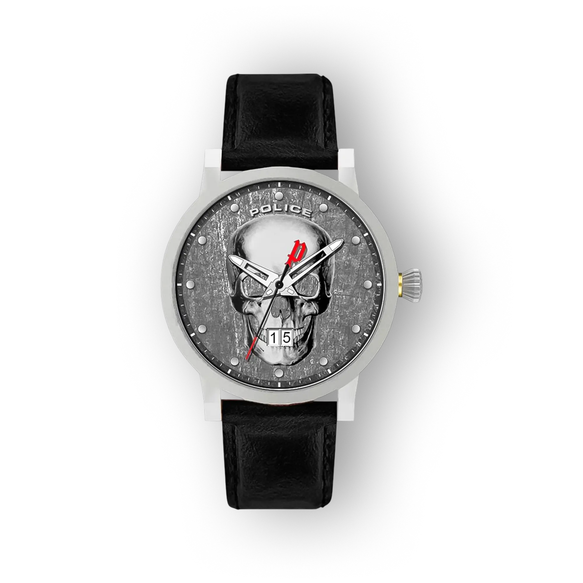 Fekete bőrszíjjal rendelkező óra, ezüst színű tokban. Az óraszámlap középpontjában koponya mintázat, piros "P" betű és piros mutató.