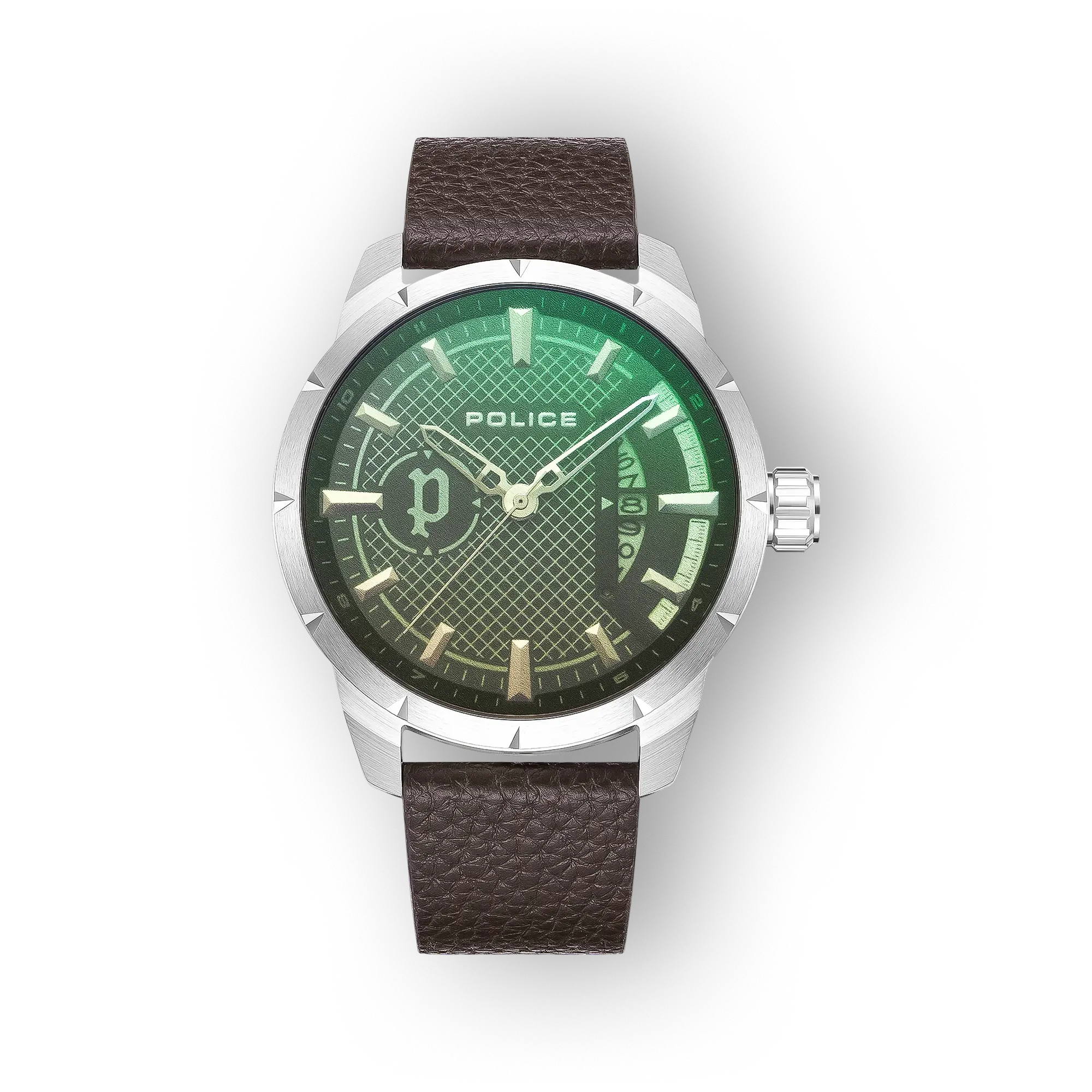 Fekete háttér előtt álló, ezüst színű, zöld árnyalatú számlappal és barna bőrszíjjal rendelkező Police karóra.
