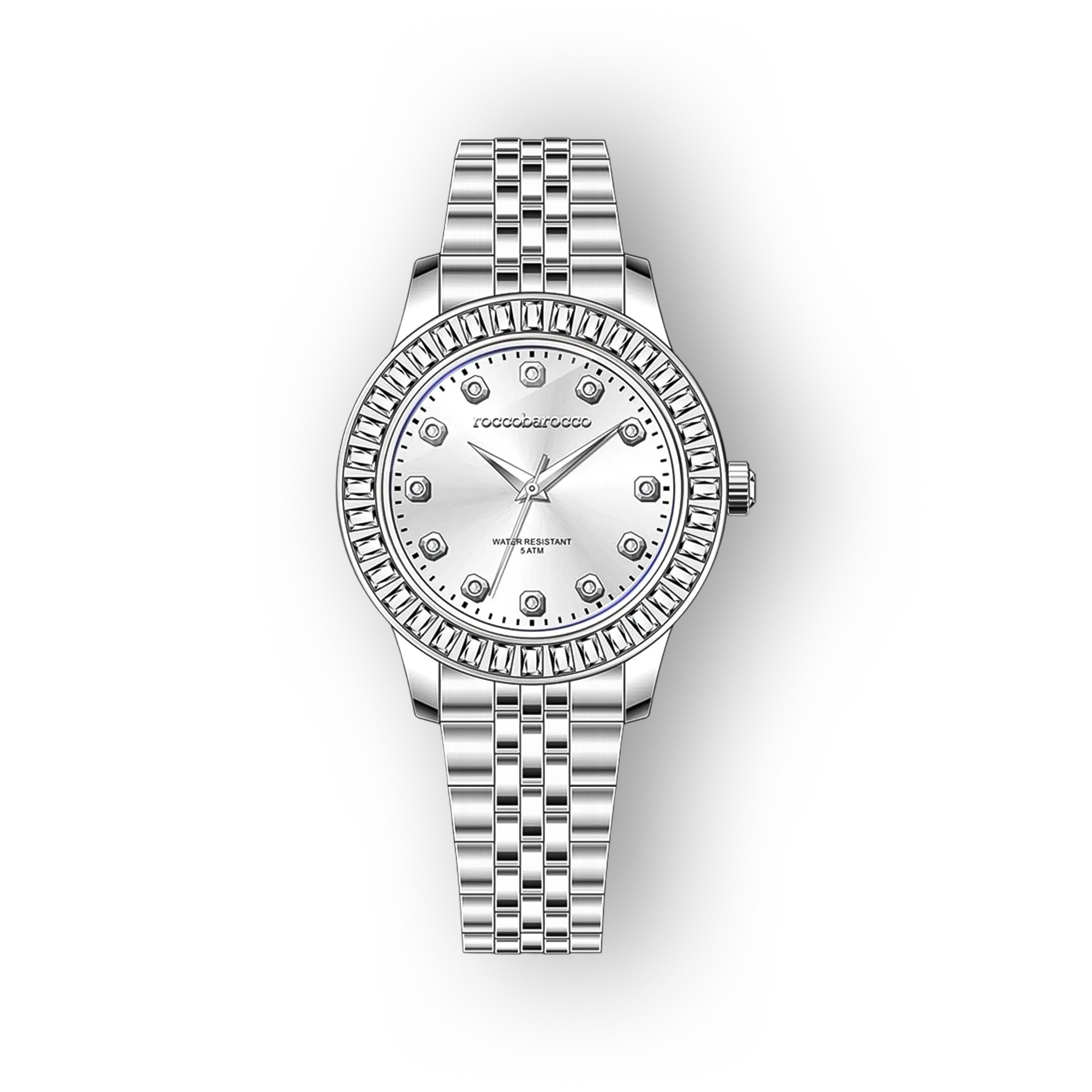 Fényes ezüstszínű Roccobarocco karóra, kristálydíszítésű kerettel, világos számlappal és fémszíjjal. Vízállósági érték: 5 ATM.