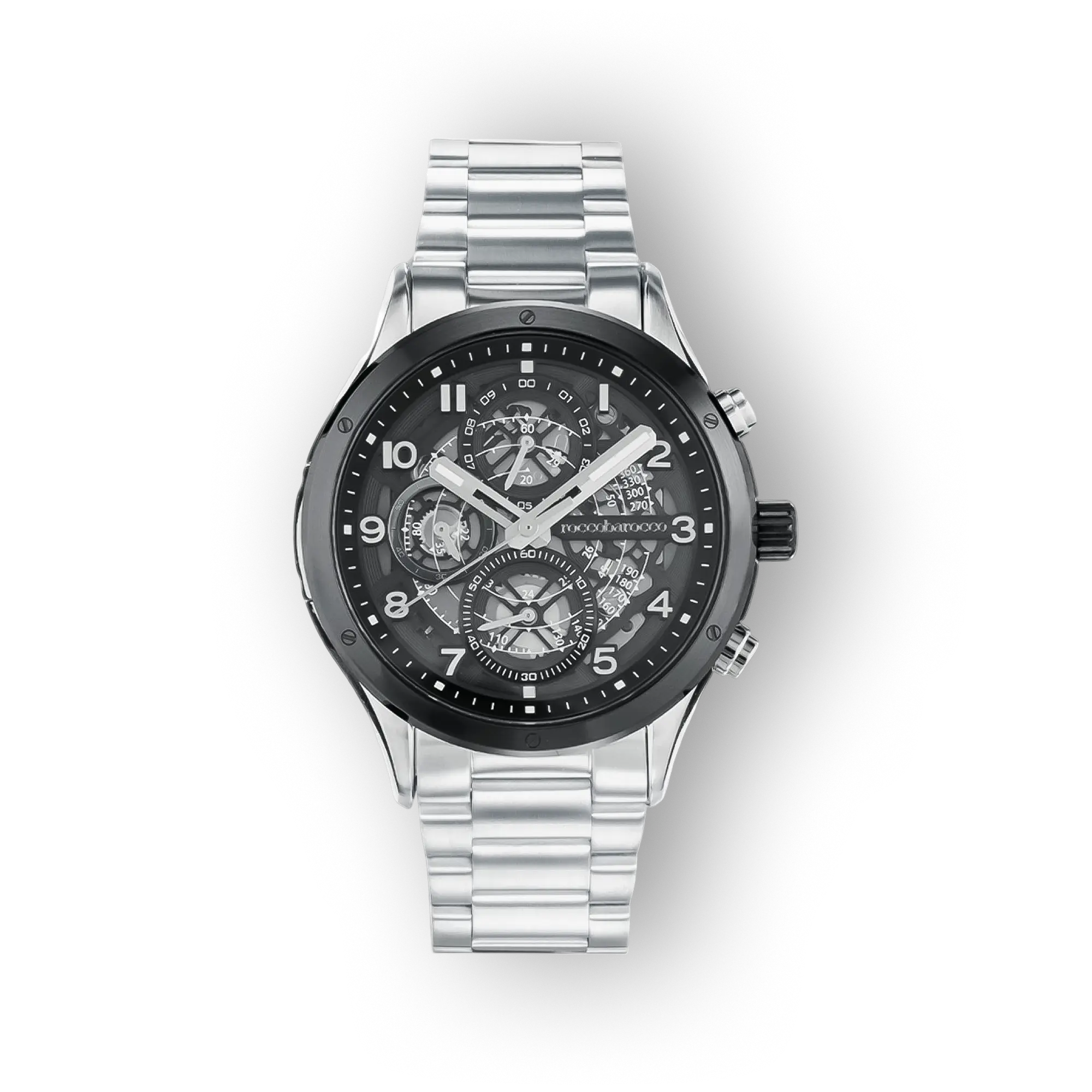 Fekete számlapú, ezüst színű fém karkötős Roccobarocco karóra, kiemelkedő kvarc szerkezettel és sportos dizájnnal.