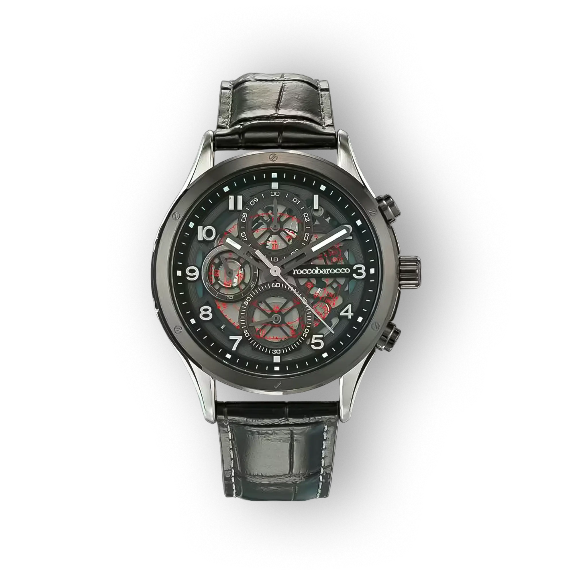Fekete számlapú, ezüstszínű Roccobarocco karóra piros részletekkel, bőr szíjjal, analóg számlappal és több kronográf funkcióval.