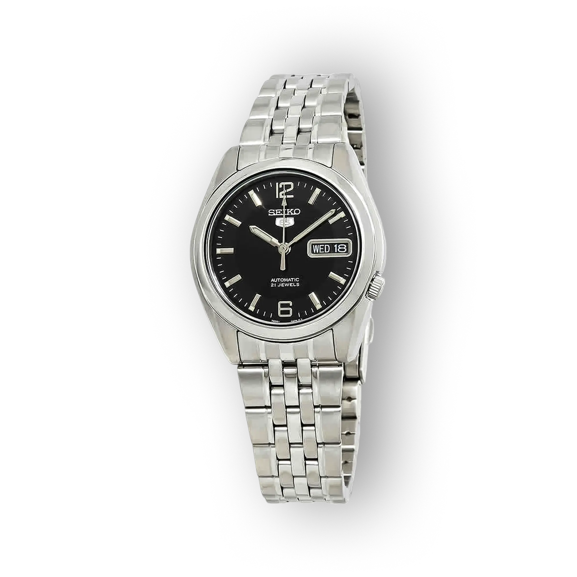 Fekete számlapos, automata Seiko 5 SNK393K1 óra, fémszíjjal, 3. és 6. óránál számokkal, nap- és dátumkijelzővel.