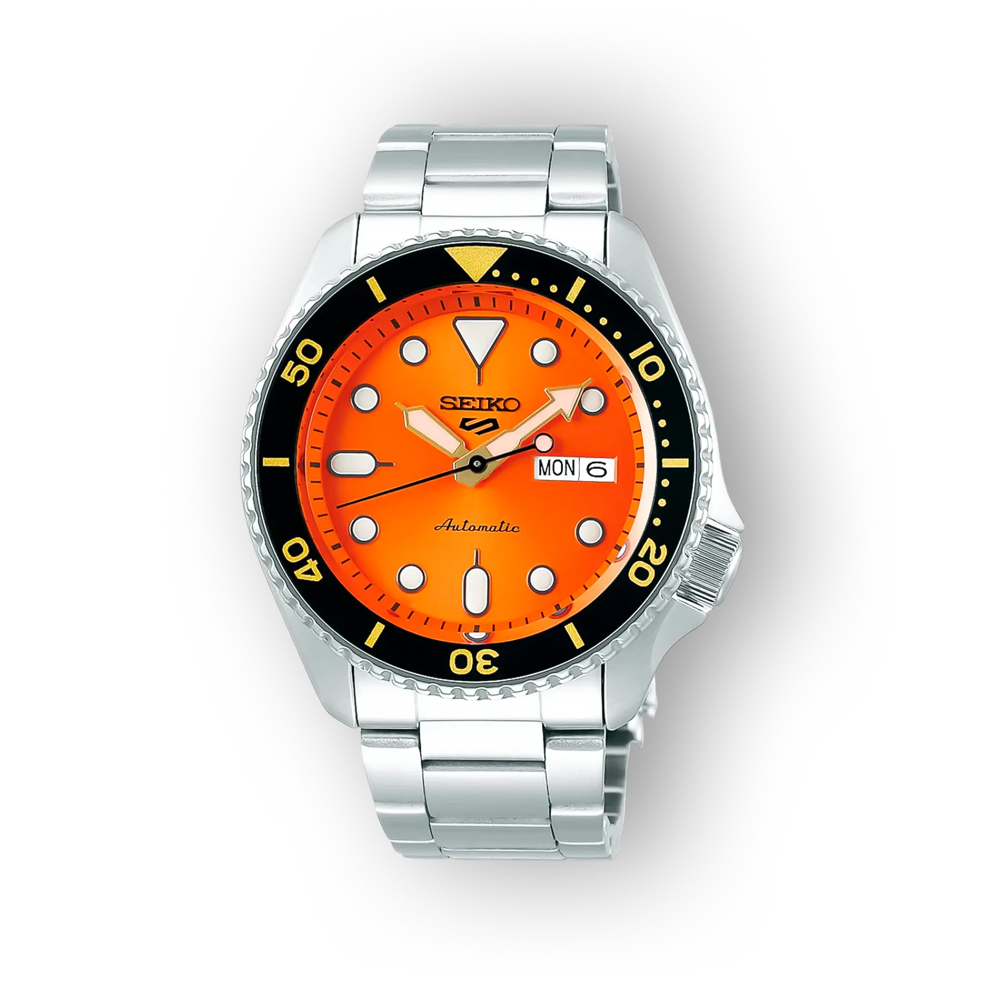 Narancssárga számlapú, automatikus Seiko 5 karóra, fekete kerettel és ezüst szíjjal, hétfői és napi dátummal.