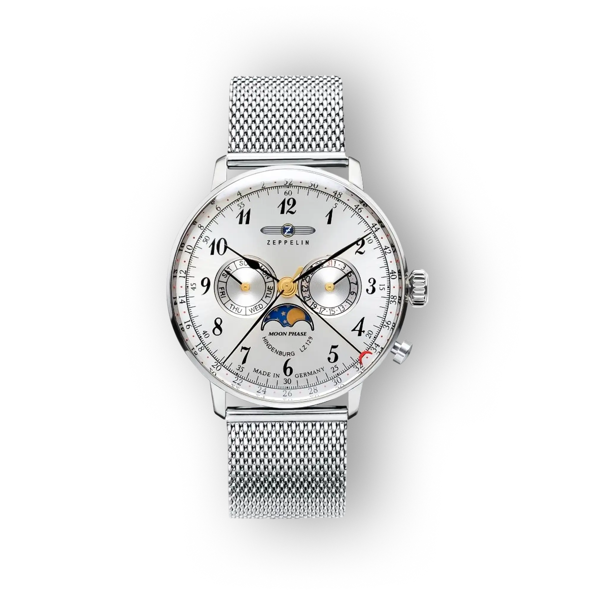 Ezüst színű Zeppelin karóra, fehér számlappal, arany színű részletekkel és holdfázis kijelzővel, hálós ezüst szíjjal.